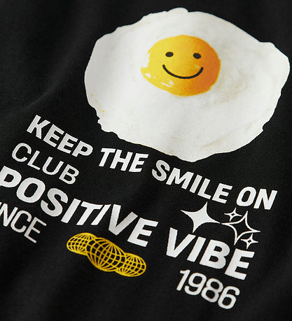 T-shirt noir Smart Name It avec un imprimé accrocheur représentant un oeufs au plat, pour une expression amusante. Sous l'imprimé, le texte « Keep The Smile On Club Positive Vibe Since 1986 » contribue à un message positif. Ce t-shirt Name It présente une encolure tour et des manches courtes pour un design simple.