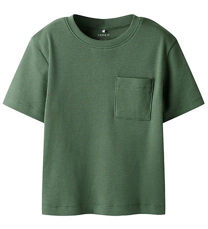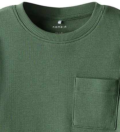 T-shirt élégant Name It dans une teinte vert foncé. Le T-shirt a une structure finement côtelée qui donne un look simple et élégant. Il y a une poche poitrine pratique à l'avant.