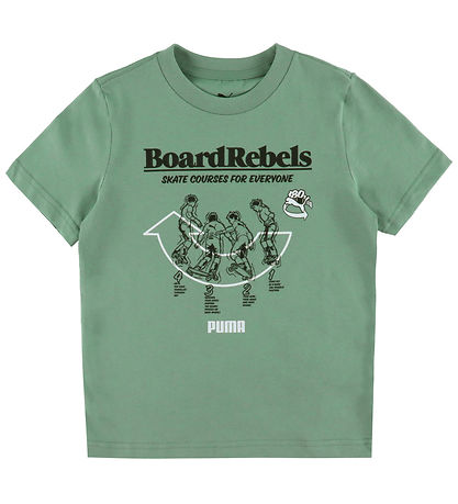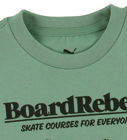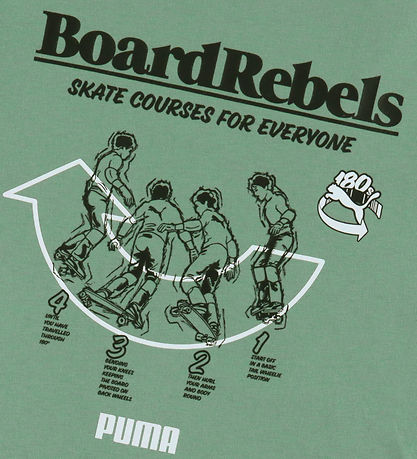 T-shirt Puma élégant d'un vert doux. T-shirt est orné d'un grand imprimé skateur sur le devant, avec les inscriptions « Board Rebels » et «Skate Courses For Everyone ». Ce t-shirt Puma présente une encolure tour à bords côtelés et des manches courtes.