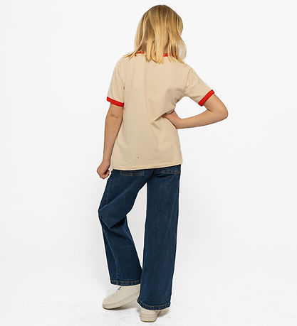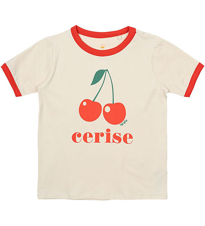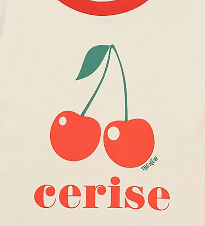 Joli T-shirt The New de couleur crème clair avec des bords rouges au niveau des manches et du col. Le T-shirt est orné d'un imprimé cerise coloré et d'un texte sur le devant, ce qui donne un look amusant et accrocheur.