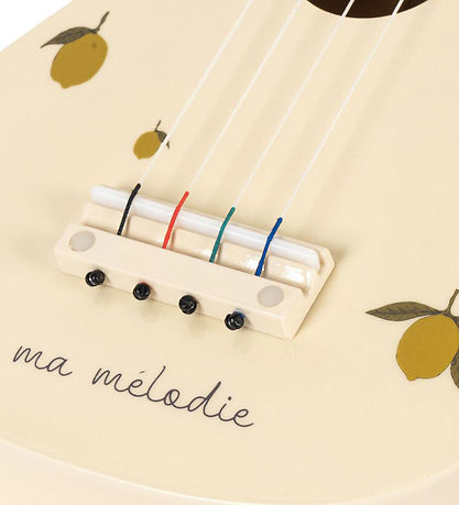 Charmant ukulele Konges Sløjd en contreplaqué et bois de pin beige avec un fin imprimé citron dans des tons jaunes et verts.