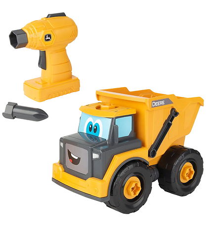 Superbe véhicule de chantier John Deere d'un joli jaune. Il est équipé de roues noir et d'une perceuse jaune. Le visage souriant du camion John Deere à l'avant lui confère une expression joyeuse et amicale.