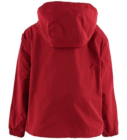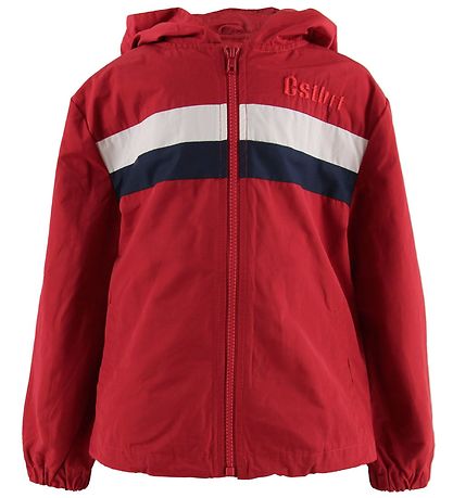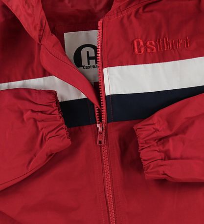 veste Smart Cost:Bart rouge avec logo Cost:Bart brodé sur la manche gauche et sur la poitrine gauche. Sur la poitrine et les épaules se trouvent deux a rayures; un en blanc et un en marine.