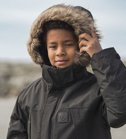 La veste d'hiver Didriksons est dotée d'une capuche amovible, fixée par À boutons poussoirs le long du col montant. L'intérieur du col est bordé d'un doux bord côtelé. La capuche est ornée d'un joli bord en faux cuir fourrure, amovible grâce à À boutons poussoirs dissimulés. Le haut de la capuche est ajustable par velcro.