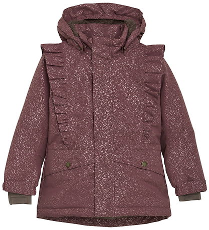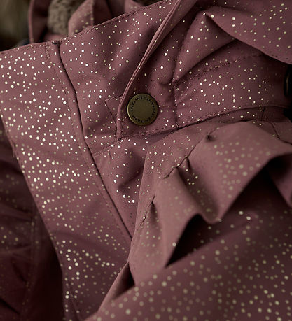 Magnifique veste d'hiver En Fant rose foncé ornée d'un motif imprimé complet or à pois brillants. Veste d'hiver est ornée de jolis volants sur les épaules.