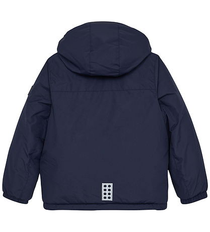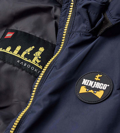 Jolie veste d'hiver LEGO® Ninjago bleu marine avec fermetures éclair jaunes et une application en caoutchouc Ninjago sur la poitrine gauche.