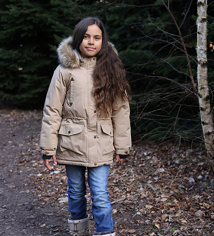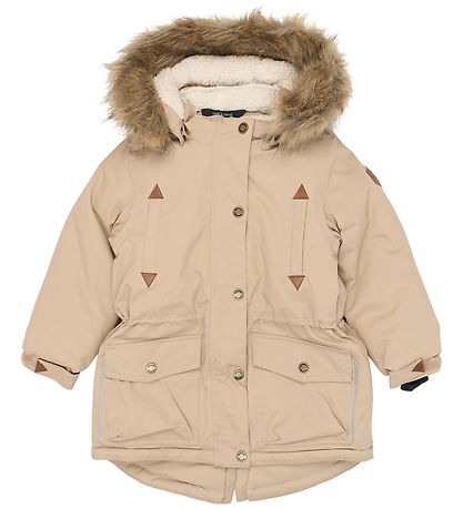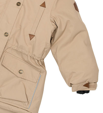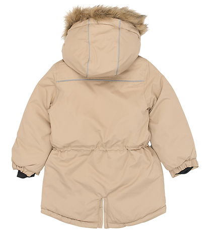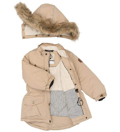 Belle veste d'hiver Mikk-Line beige avec taille en cuir et détails réfléchissants.