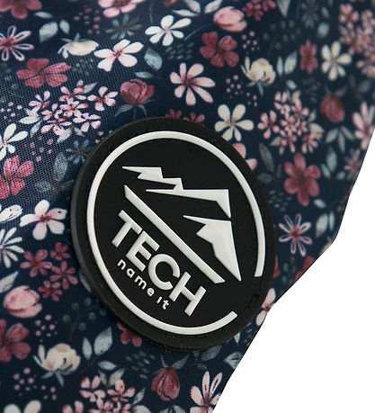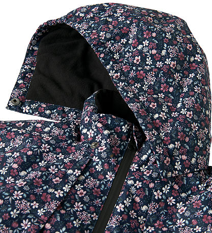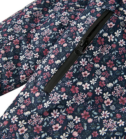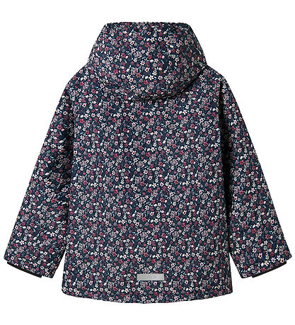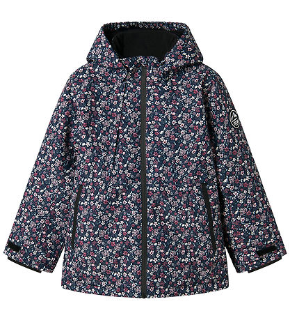 veste d'hiver Nice Name It bleu marine avec un imprimé floral dans les tons violet, blanc et vert.