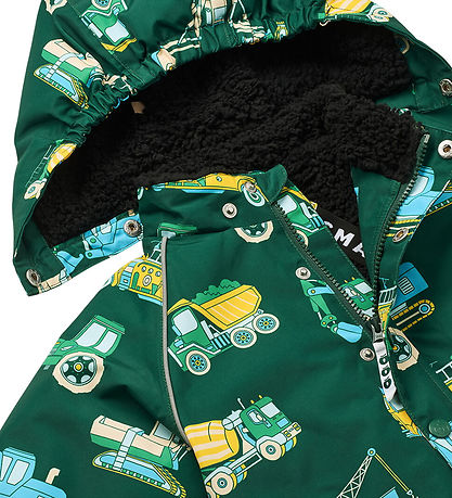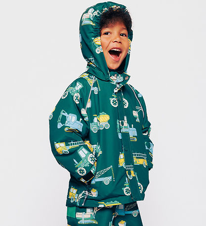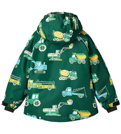 Magnifique veste d'hiver Småfolk vert foncé ornée d'un imprimé intégral de véhicules de chantier colorés. Des passepoils réfléchissants pratiques bordent les manches.