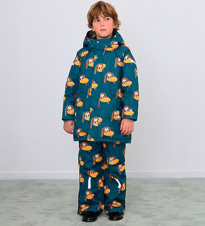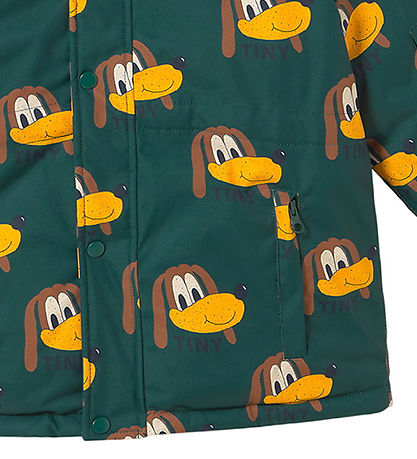 Magnifique veste d'hiver Tiny Cottons dans une teinte vert pétrole avec un charmant imprimé chien dans des tons jaunes et marron.