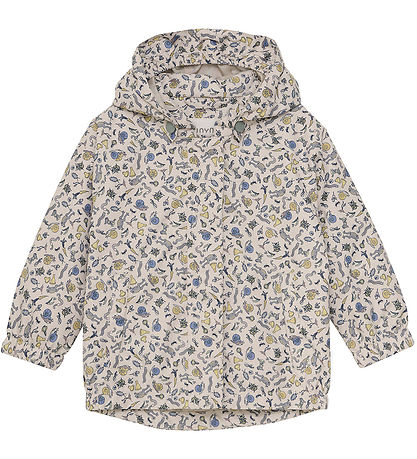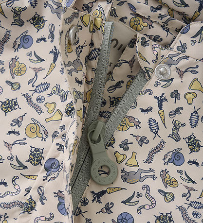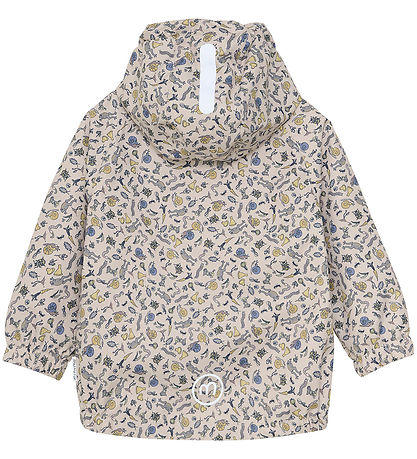 veste imperméable cool Minymo dans une teinte grise chaude avec un imprimé all-over de petits animaux et de plantes dans des tons verts, bleus et jaunes. La Veste imperméable est fabriquée dans une belle qualité PE.