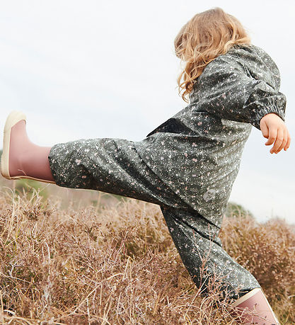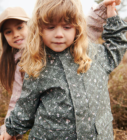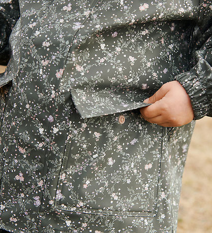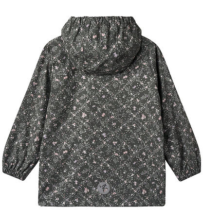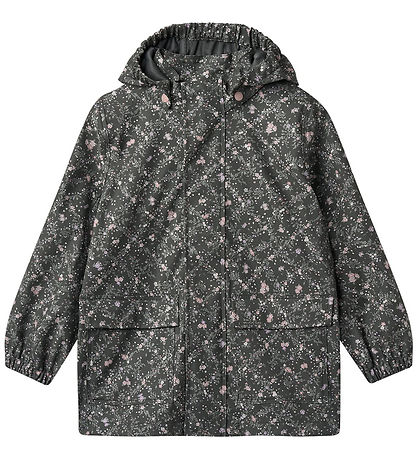 Belle veste imperméable Wheat en PU gris charbon foncé avec un petit imprimé floral allover dans des tons violets, roses et verts.