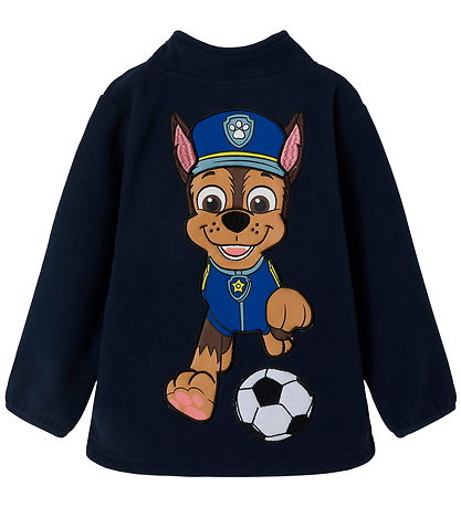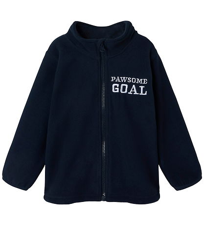 Veste polaire élégante Name It en bleu marine foncé avec le texte « Pawsome Goal» brodé en blanc sur la poitrine.