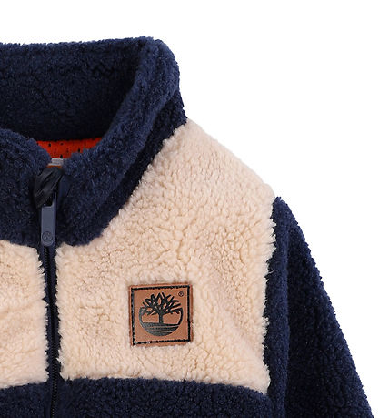 Veste polaire Timberland accueillante en polaire pilou douce bleu marine avec une section contrastante de couleur crème sur la poitrine.
