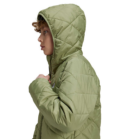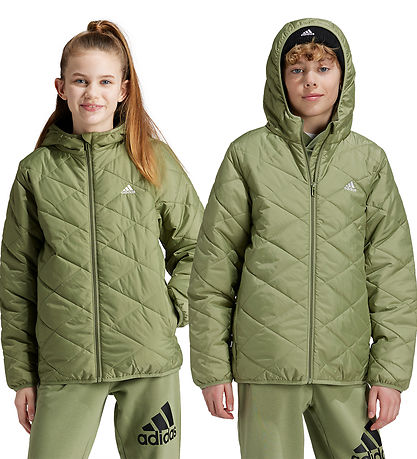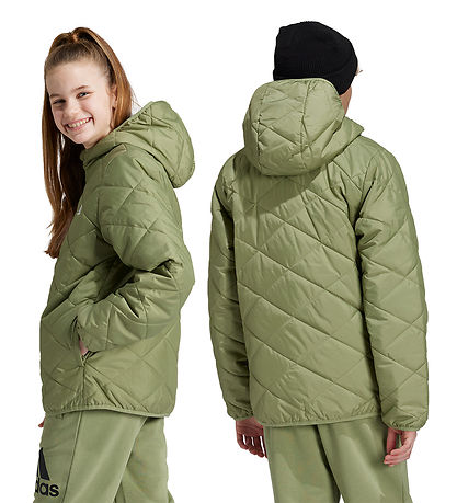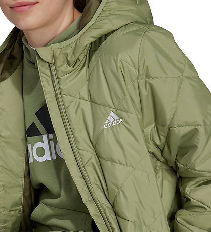 veste rembourrée Smart adidas Performance en vert cendré de couleur unie, et sur le côté gauche il y a un logo blanc brodé.