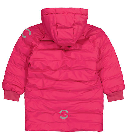 Ravissant veste rembourrée Mikk-Line en PU rose avec surpiqûres horizontales. Il y a des bandes réfléchissantes le long de la fermeture éclair et un logo réfléchissant dans le bas du dos.