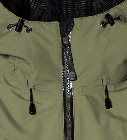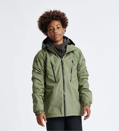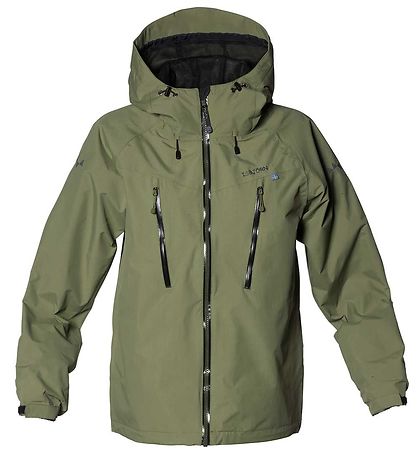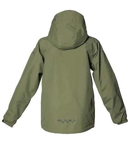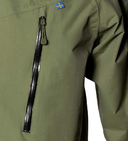 Belle veste shell ISBJÖRN OF SWEDEN de vert militaire avec des zips noir. La veste shell présente des logos noir imprimé logo sur la poitrine gauche et sur la capuche, ainsi que des imprimés réfléchissants intelligents sur le bas du dos et les deux épaules.