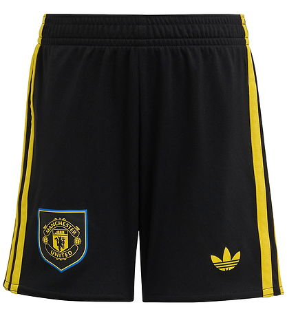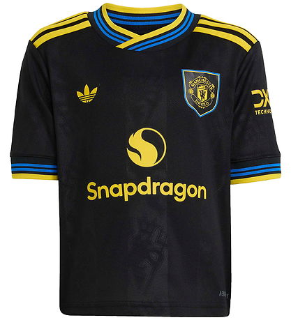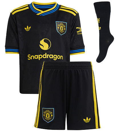 Superbe vêtements de football adidas Originals noire avec des détails bleus et jaunes. Sur le devant, le maillot imprimé le logo du club anglais de Manchester United. Ensemble s'inspire de la troisième set de l'équipe lors de la saison 2025/2026.