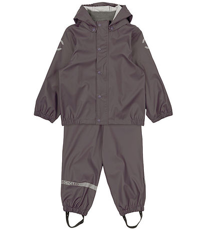 Joli vêtement de pluie Mikk-Line composé d' un pantalon de pluie et d'une veste imperméable en marron foncé de couleur unie avec des détails réfléchissants et des logos bien placés.