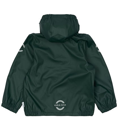 Joli vêtement de pluie Mikk-Line composé d' un pantalon de pluie et d'une veste imperméable en vert foncé de couleur unie avec des détails réfléchissants et des logos bien placés.