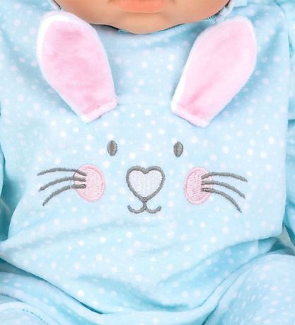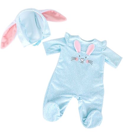 De jolis vêtements de poupée Tiny Treasures composés d'une grenouillère et d'un bonnet de bébé. La Grenouillère est bleu avec un imprimé intégral de petits points blancs. Devant se trouve un Lille Kanin avec deux oreilles de lapin attachées. Le Bonnet de bébé a deux longues oreilles.
