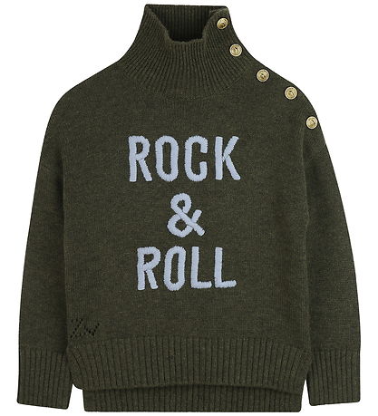 blouse Smart Zadig & Voltaire en vert foncé chiné, avec l'inscription « Rock And Roll » en bleu clair sur le devant. Ce Chemisier est confectionné en maille de laine chaude.