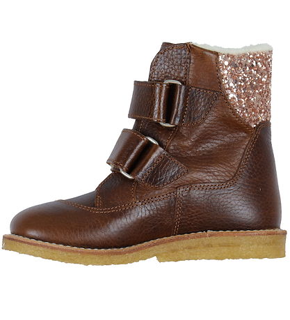Jolies bottes d'hiver Angulus en cuir marron foncé, avec de belles brillant rose sur le haut de l'ouverture.
