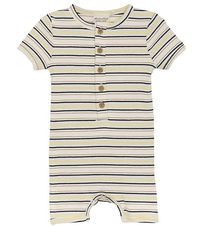 Le barboteuse d'été Minymo a des manches et des jambes courtes et est ouvert au niveau de la fermeture à tige sur le devant avec de fins boutons aspect bois et à boutons poussoirs réguliers entre les jambes. Il y a des bords côtelés étroits à toutes les ouvertures et la barboteuse d'été est confectionnée dans une qualité douce et extensible.