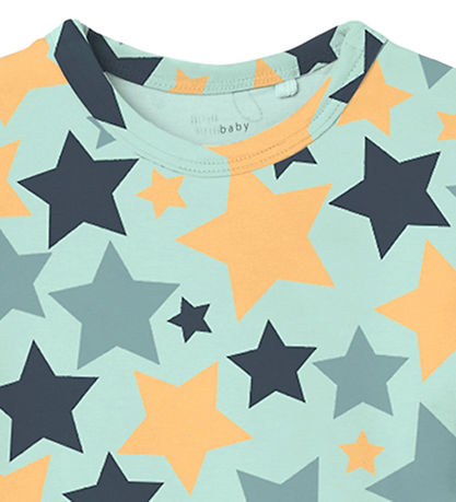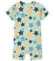 Joli barboteuse d'Été Name It en vert clair avec un fin imprimé complet d'étoiles en bleu foncé, vert et orange.