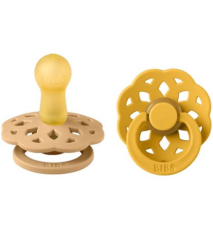 tétine Smart BIBS vendues en 2 Pack en jaune moutarde et marron en jolie forme de fleur.