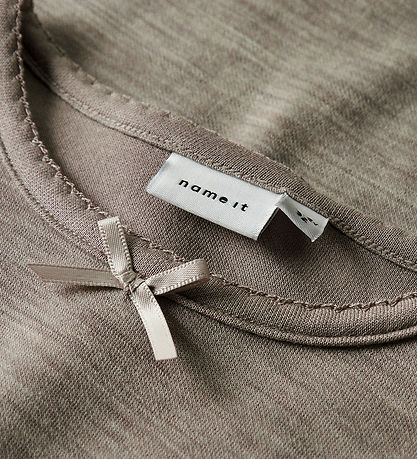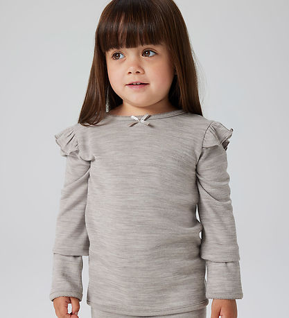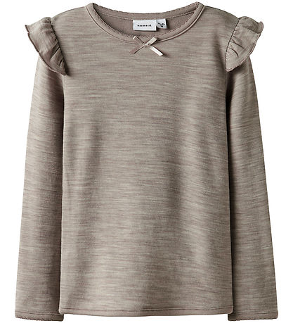 Élégant blouse Name It en gris-marron chiné. Chemisier présente une encolure tour bordée d'une fine dentelle et d'un noeud papillon sur le devant. Ses manches longues sont ornées de volants aux épaules et de fines bordures en dentelle à l'ouverture des manches. Chemisier est fabriquée avec en laine mérinos et viscose.