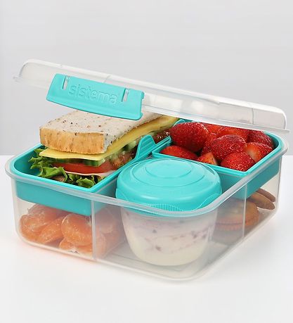 boîte à repas Smart Sistema en plastique prêt avec détails turquoise. La Boîte à repas a une capacité maximale de 1,25 l. Un récipient tour plus petit en plastique prêt avec un couvercle turquoise est également inclus. Ce récipient a une capacité maximale de 150 ml.