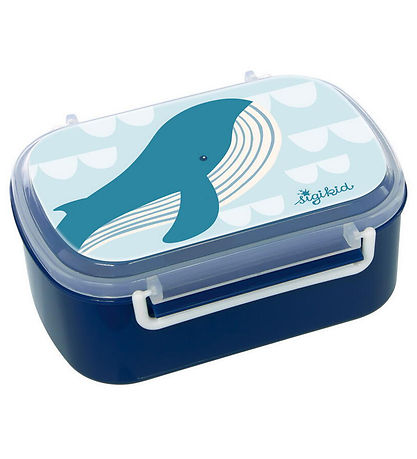boîte à repas Smart Sigikid de couleur marine avec un couvercle blanc transparent, avec un imprimé baleine sur le dessus.
