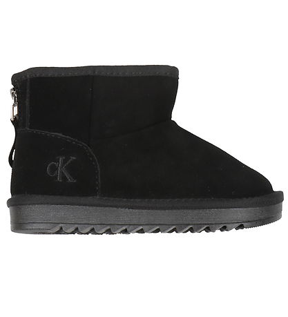 Magnifiques bottes en peluche Calvin Klein en daim noir avec un logo noir brodé à l'extérieur. À l'arrière se trouve une fermeture éclair avec un détail réfléchissant.