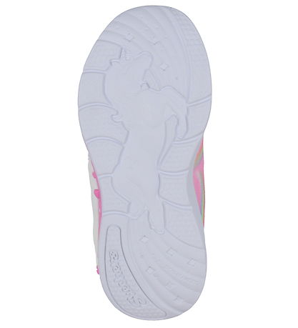 Jolies chaussures Skechers roses avec des brillant et des petits arcs-en-ciel, ainsi qu'une licorne 3D à l'extérieur des chaussures. Les chaussures ont des lumières clignotantes dans les semelles extérieures qui sont activées.