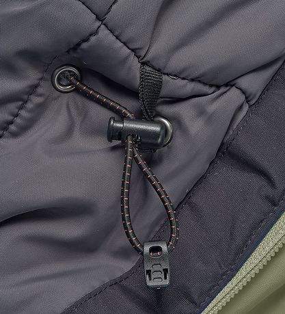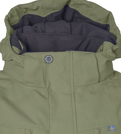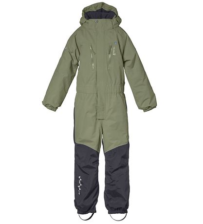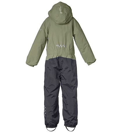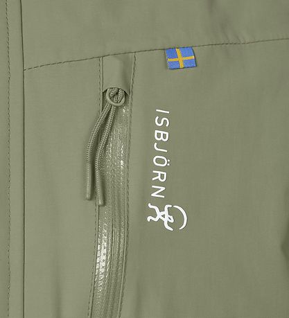 Jolie combinaison de ski ISBJÖRN OF SWEDEN en vert militaire et noir. La Combinaison de ski présente des imprimé logo sur la poitrine gauche et sur la capuche, ainsi que des imprimés réfléchissants intelligents dans le bas du dos, sur les épaules et les chevilles.