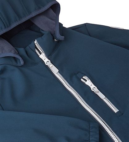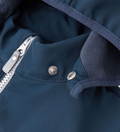 Magnifique combinaison softshell Reima bleu marine avec des fermetures éclair blanches et une belle doublure en polaire douce à l'intérieur.