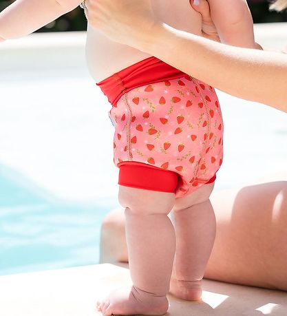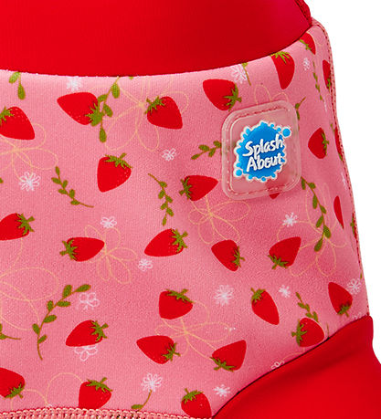 couche de natation Cute Splash About rose avec un joli imprimé de fraise dans de jolies couleurs. Le Couches de natation a de larges bords rouges.
