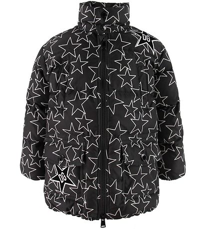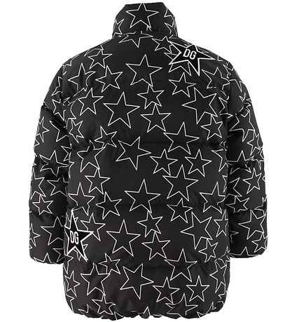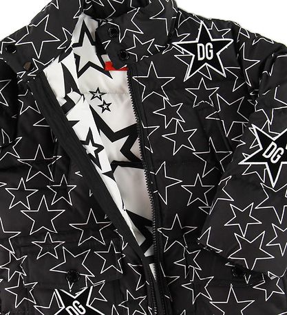doudoune Smart Dolce & Gabbana en noir avec étoiles blanches. Tout autour se trouvent des étoiles en velours noir avec des bords blancs et les lettres « DG » au milieu.