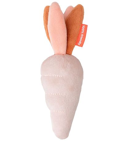 - Un hochet en forme de carotte rose avec des petites boules à l'intérieur du hochet lorsque l'enfant le secoue. En haut se trouvent quatre rabats qui font des crépitements lorsque l'enfant les touche.