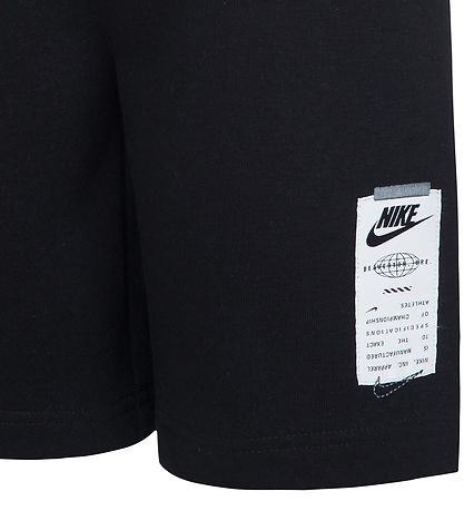 - Le Shorts en molleton est noir, avec une application blanche avec une écriture noire sur la cuisse gauche.