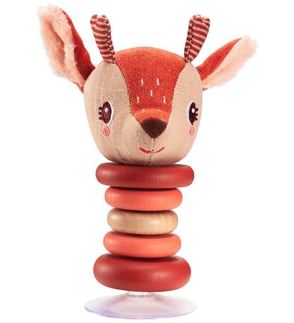 hochet Lilliputiens bois de marron avec une tête de bambi sur le dessus et des anneaux en bois naturel, rose et marron.