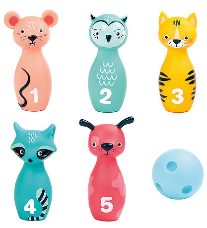 Ensemble de quilles divertissant Ludi composé de cinq cônes à motifs d'animaux et d'une boule de quilles bleu menthe.