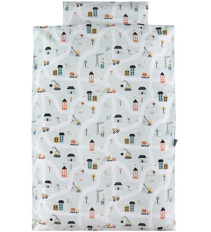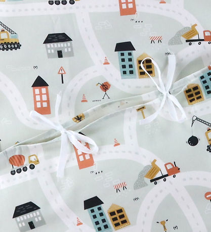 literie Smart Nørgaard Madsens en marron clair avec un imprimé coloré sur toute la surface de routes, de maisons et de diverses machines de travail.