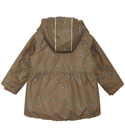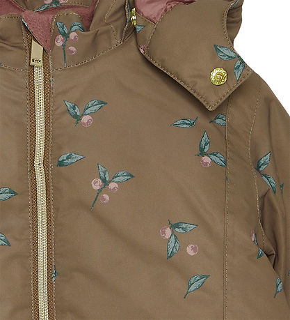 Magnifique manteau d'hiver Hust and Claire marron avec un imprimé intégral de baies roses et de feuilles vertes.
