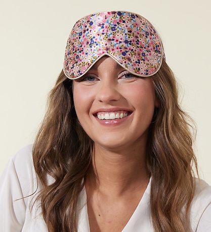 Joli masque de nuit Fan Palm rose avec un imprimé complet de fleurs bleu marine, bleu, rose et marron.