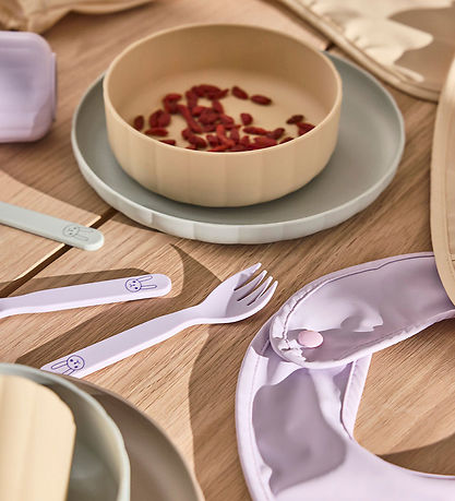 Fin couverts pour enfants OYOY de couleur violet lavande avec un imprimé de lapins au bout du manche.