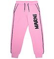 pantalon de jogging Smart Marni bleu avec a rayures blanches sur les bords. Jambes de pantalon avec le nom "Marni" imprimé en bleu avec des ombres noir.