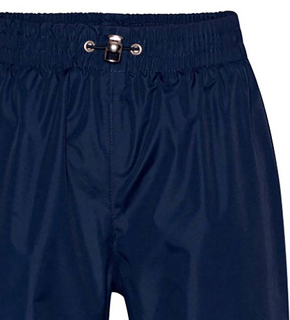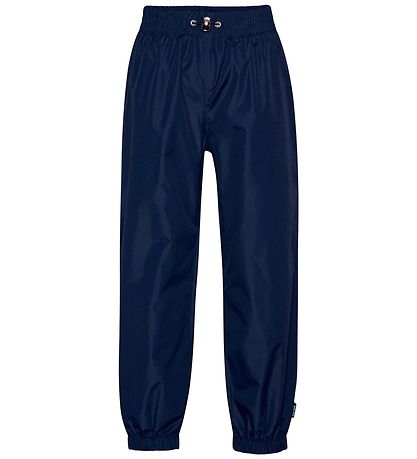 Superbe pantalon de pluie Molo en PE bleu marine de couleur unie et avec un réflecteur de logo pratique à l'arrière de la jambe droite.