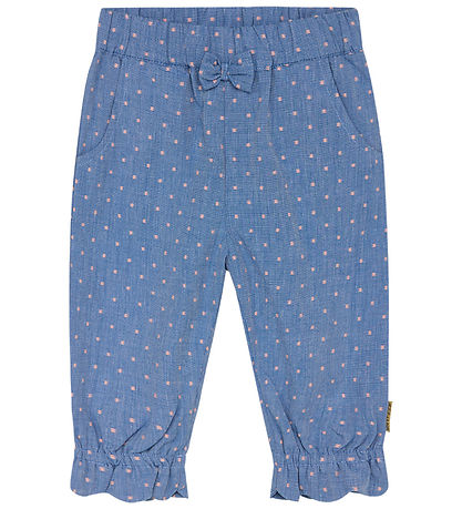 Pantalon Sweet Hust and Claire bleu avec un joli imprimé all-over de points roses.